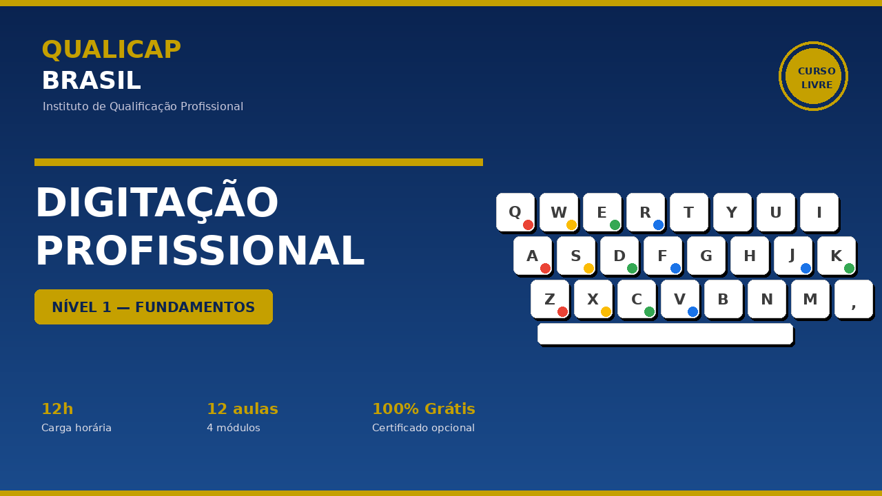 Neste curso você vai aprender a digitar profissionalmente usando todos os 10 dedos, sem olhar para o teclado. Começando pela postura correta e posição base, avançando fileira por fileira até dominar o teclado completo (letras, números, acentos e pontuação). Cada aula inclui exercícios práticos progressivos e metas de velocidade (PPM) e precisão.